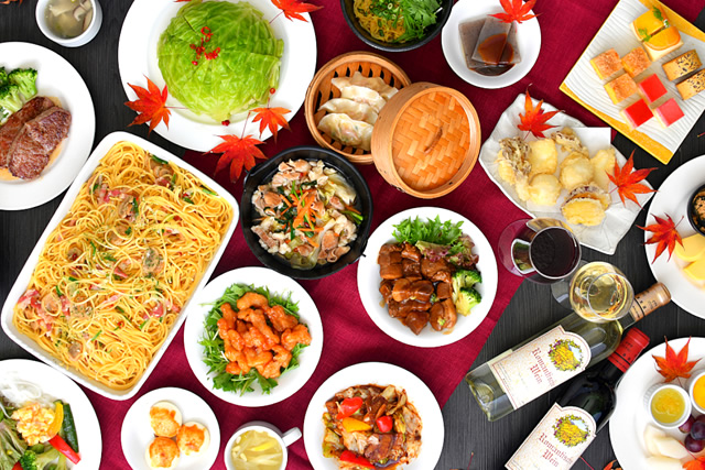 自家製チキンソテー秋茸ソース|秋サーモンの香草風味|ソフトシェルと秋野菜のアヒージョ|きのこの御切込鍋|榛名豚ミラノ風カツレツ|上州牛内もも肉ステーキ 自家製ソース3種|ホテル自家製漬けダレ激旨スペアリブ|日替りピザ|日替りパスタ|日替り握り鮨5種|天麩羅5種|海鮮茶碗蒸し(海老・帆立)|上州牛牛丼|ホテル特製スパイスカレー|丸ごとキャベツ|おこわ風栗御飯|しじみ味噌汁|日替り中華4種|自家製モンブラン|自家製ショコラムース|自家製クリームブリュレ|林檎キャラメルケーキ|ティラミス|ベイクドチーズケーキ|巨峰orシャインマスカット|梨or柿|チョコレートフォンデュ 他全約50種